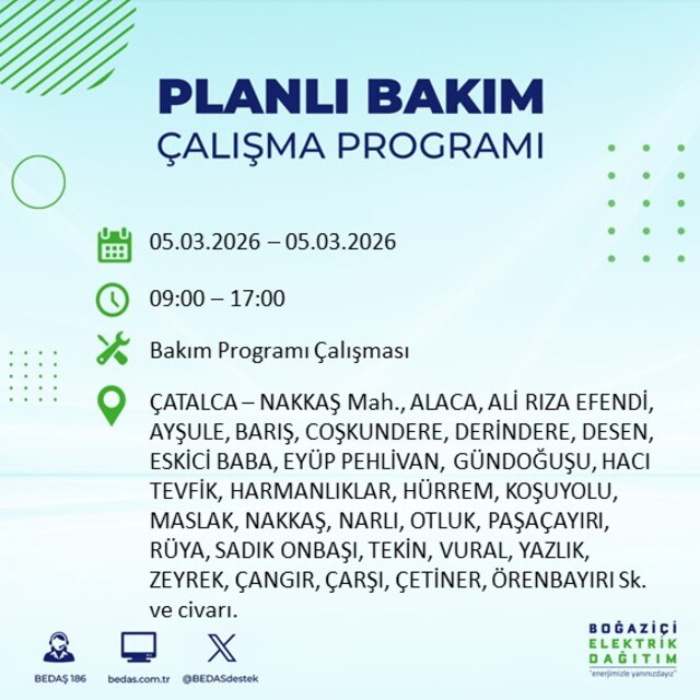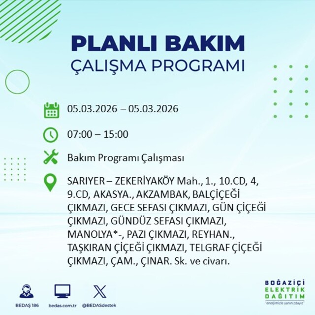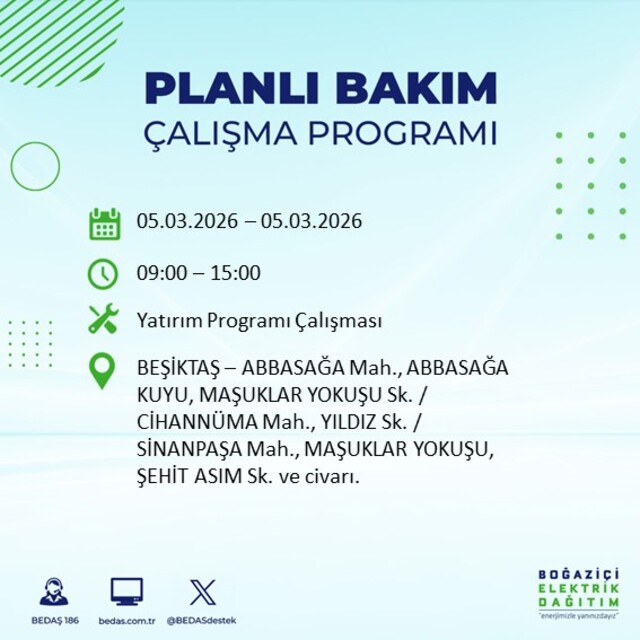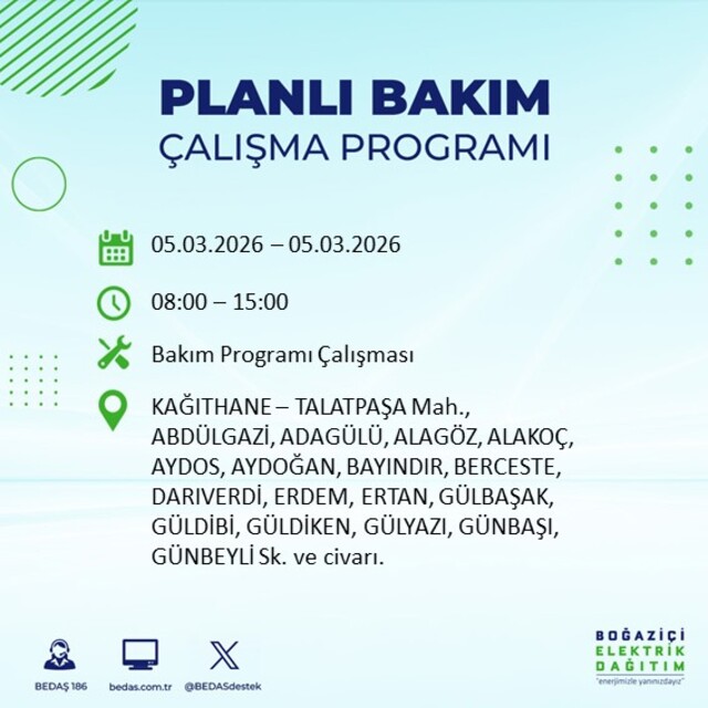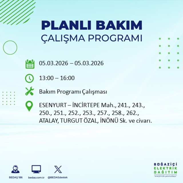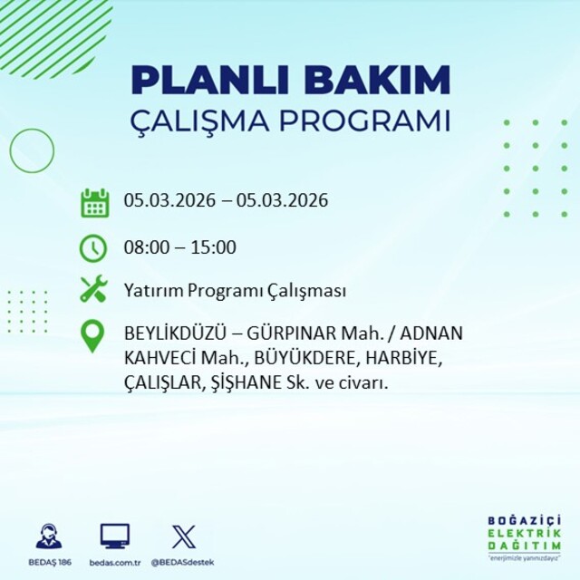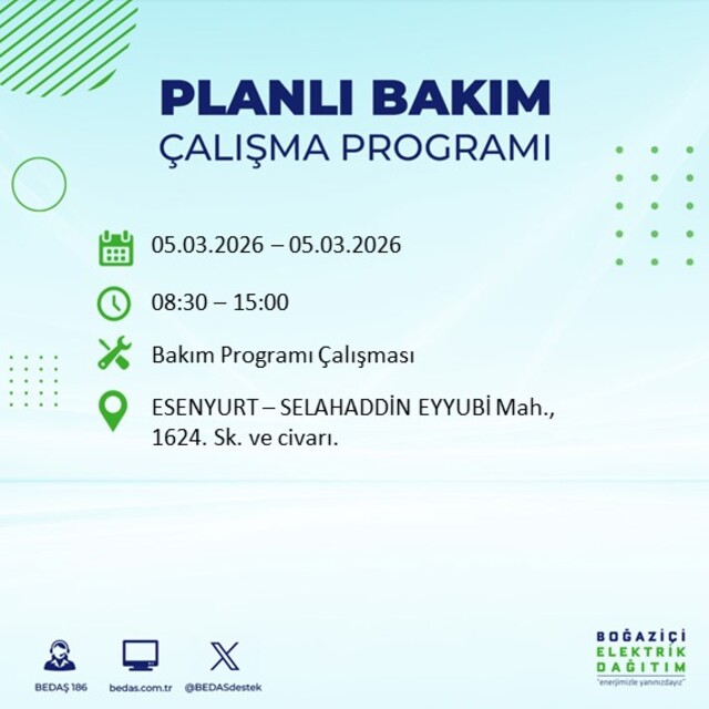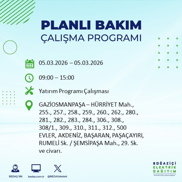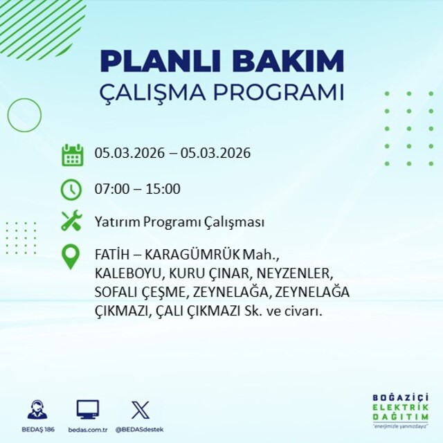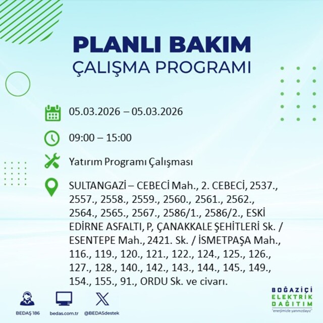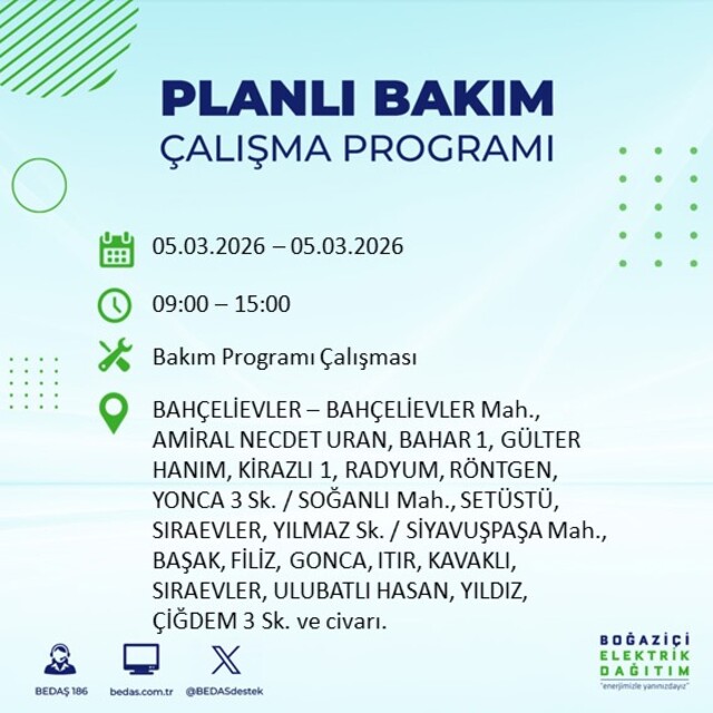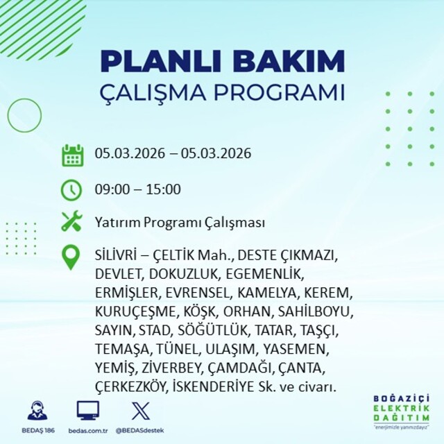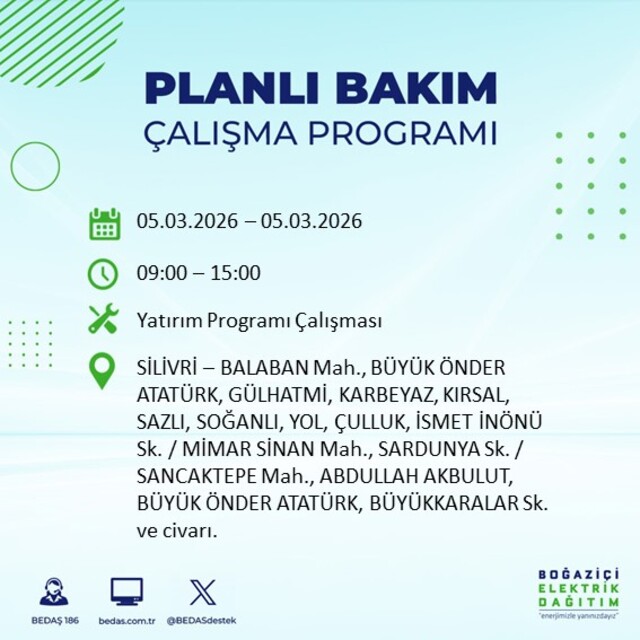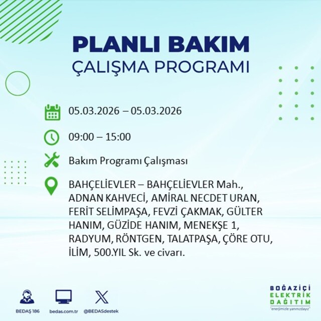 BEDAŞ, 5 Mart yarın İstanbul'un 22 ilçesinde planlı elektrik kesintisi yapılacağını açıkladı. Buna göre; Zeytinburnu, Şişli, Sultangazi, Silivri, Sarıyer, Küçükçekmece, Kağıthane, Güngören, Gaziosmanpaşa, Fatih, Eyüpsultan, Esenyurt, Çatalca, Büyükçekmece, Beyoğlu, Beylikdüzü, Beşiktaş, Başakşehir, Bakırköy, Bahçelievler, Bağcılar, Avcılar'da elekrik kesintileri yaşanacak. İşte, 5 Mart 2026 İstanbul'da elektriği kesilecek ilçeler ve mahalleler