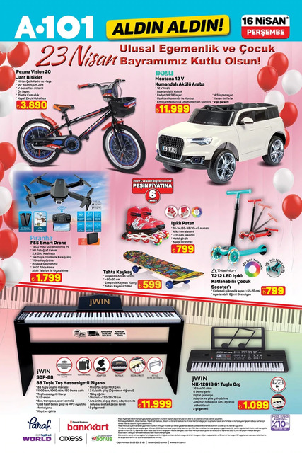 A101 marketin 16 Nisan 2026 tarihli aktüel kataloğu yayımlandı. Yarın itibarıyla A101 mağazalarında televizyon, Bluetooth kulak içi kulaklık, üç tekerlekli elektrikli araç ve elektrikli bisiklet gibi dikkat çeken ürünler satışa çıkacak. Bunların yanı sıra, ankastre cam set, buzdolabı, motor kaskı, şarjlı rondo, el blender seti, koltuk ve halı yıkama makinesi ile drone gibi çeşitli elektronik ve ev ürünleri de raflarda yerini alacak. Kampanya kapsamında ayrıca ışıklı paten, tuş hassasiyetli piyano, gölgelikli salıncak, kumandalı akülü araba ve farklı valiz seçenekleri de tüketicilerin beğenisine sunulacak. İşte 16 Nisan 2026 Aldın Aldın broşürü haberimizde...