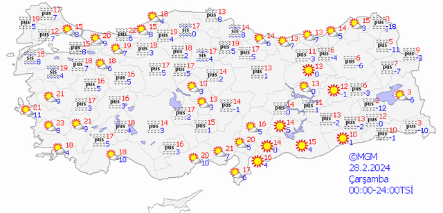 Yurt genelinde yarın yağış beklenmese de birçok ilimizde hava kapalı ve puslu olacak. Öte yandan 28 Şubat Çarşamba günü Güney Doğu Anadolu Bölgesi'nde güneşli hava hakim olacak. Meteoroloji Genel Müdürlüğü tarafından paylaşılan hava durumu haritası ile "Yarın (28 Şubat 2024) İstanbul, Ankara, İzmir ve Türkiye genelinde hava nasıl olacak" sorusu yanıt buldu. İşte, yarınki hava durumu...