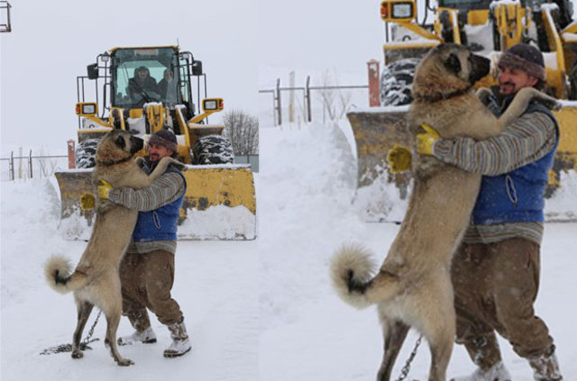 Sivas'ta kar sonrası kapanan yol nedeniyle Meraküm Tepesi'ndeki üretim tesislerinde bulunan kangalların 3 gündür yiyecek sıkıntısı yaşamasına neden oldu. İl Özel İdaresi ekiplerinin kurtardığı bir kangal böyle teşekkür etti.