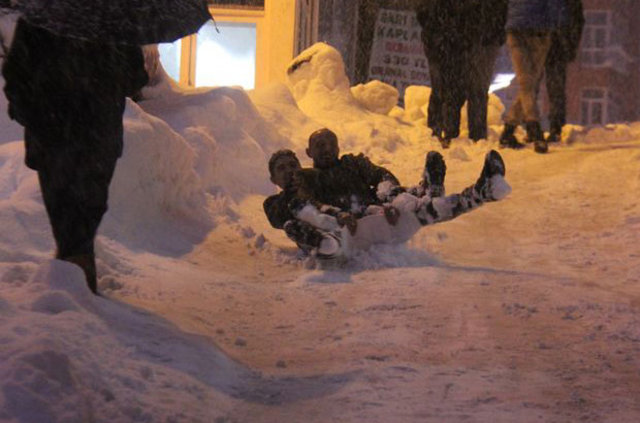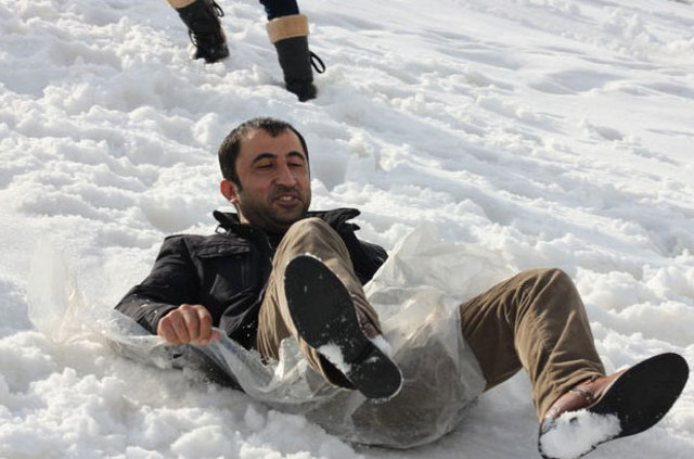 Bingöl'de kar yağışı nedeniyle en etkili ulaşım ve eğlence aracı naylon poşetler oldu.