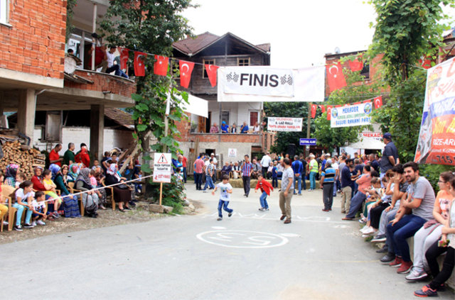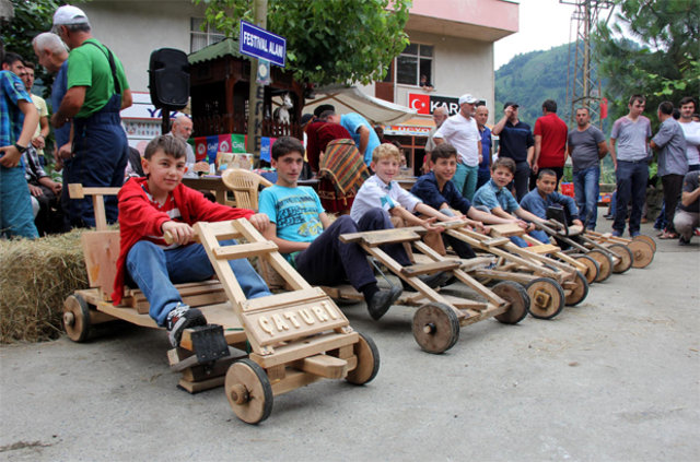 Dikkaya Köyü'nde önce bayramlaşan yöre sakinleri, tekerlekli tahta arabalarla düzenlenen Laz Ralli yarışlarını izlemek için köy meydanında toplandı.