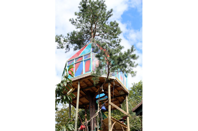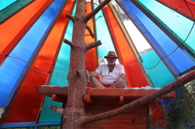 Artvin'in Arhavi ilçesine bağlı Kemerköprü köyünde yaşayan inşaat mühendisi Kaba, çam ağacının gövdesine 8 köşeli ve konik çatılı 18 metrekarelik ev inşa etti