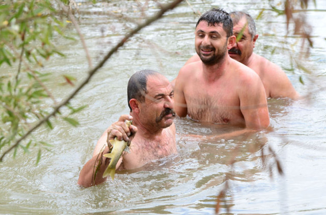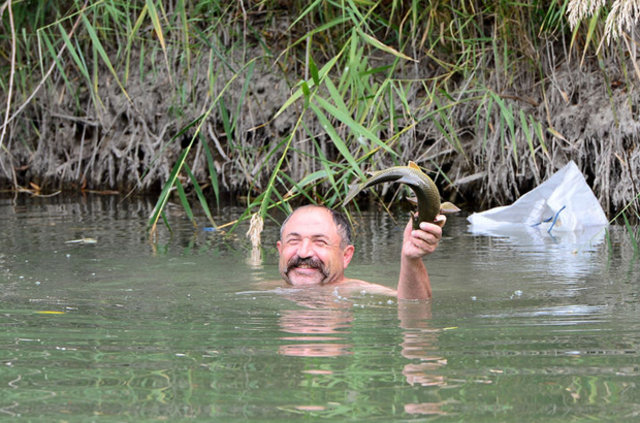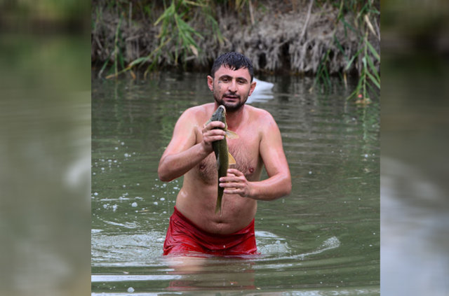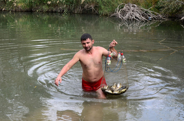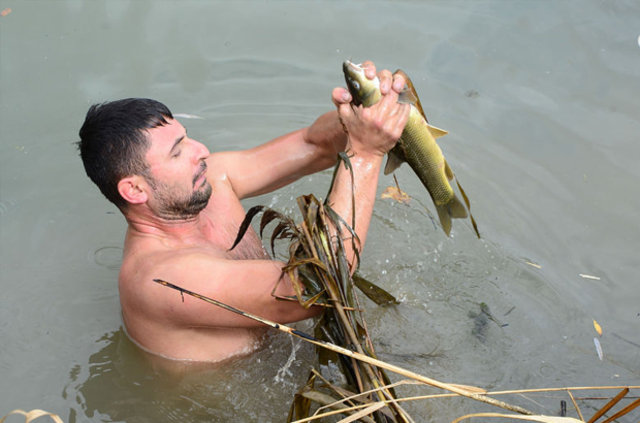 Balık avı sezonunun açılmasıyla Uşak'taki amatör balıkçılar, akarsu, dere ve göllerde "rastgele" diyerek oltalarını suya bırakırken, İbrahim Teker ve kardeşi Mehmet Teker de elleriyle yakaladıkları balıkları çuval ya da tel sepette kıyıya taşıyor.