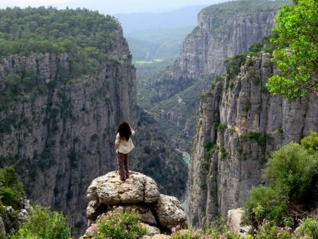 Antalya'nın Manavgat İlçesi'ndeki dünyaca ünlü rafting merkezi Köprülü Kanyonu'nun pek bilinmeyen üst kısımlarında yeni bir kanyon keşfedildi. Gezginler, yaklaşık 200 metrelik uçurumda dev kayalıklar arasından muhteşem Köprüçay manzarasıyla poz veriyor.