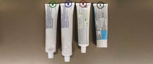 Bu renkler, ürünlerin paketleme süreçlerinde işe yarıyor. Makinelere, diş öacunu tüpünü, nerden kıvırmaları nereden kesmeleri gerektiğini söylüyorlar. Renklerin farklılık göstermesi ise, makine sensörlerinin paketleme kolaylığı ile ilgili...