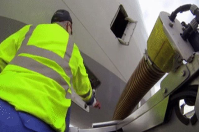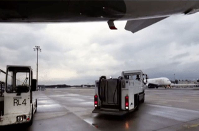 Uçak piste indiğinde küçük bir araba uçağın alt bölmesine yaklaşıyor...