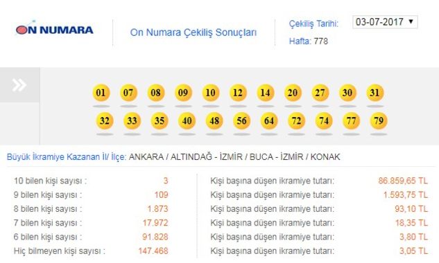 3 Temmuz 2017 On Numara sonuçları: 01 - 07 - 08 - 09 - 10 - 12 - 14 - 20 - 27 - 30 - 31 - 32 - 33 - 35 - 40 - 48 - 56 - 64 - 72 - 74 - 77 - 79