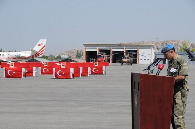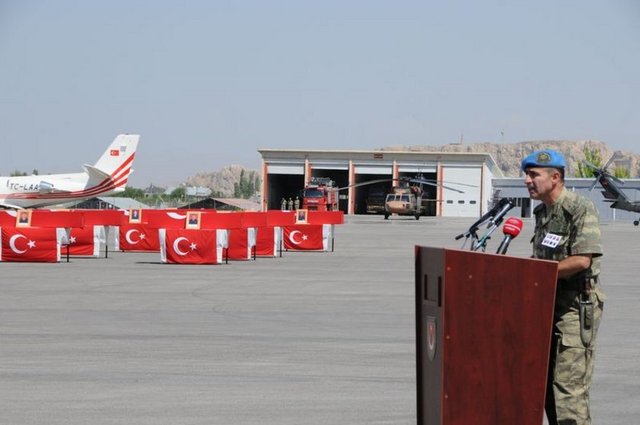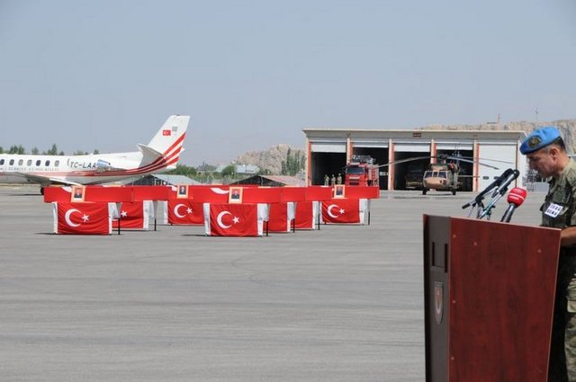 Şehit Jandarma Binbaşı Yavuz Başayar, Jandarma Uzman Çavuşlar Turan Kurt, Hakan Çil, Nazır Elitok, Erhan Ar ile Piyade Uzman Çavuş Samet Kılıç, Jandarma Onbaşı Vedat Gülder ile jandarma er Serkan Altay'ın cenazeleri Hakkari Dağ ve Komando Tugay Komutanlığı'nda düzenlenen törenin ardından 6 helikopterle Van'a getirildi. Jandarma Pilot Yarbay Yusuf Turgut Kışlası Helikopter Filo Komutanlığı'na indirilen cenazeler için burada tören düzenledi. Törene İçişleri Bakanı İdris Naim Şahin, Milli Savunma Bakanı İsmet Yılmaz, Van Valisi Münir Karaloğlu, 2. Ordu Komutanı Orgeneral Servet Yörük, Van Jandarma Asayiş Kolordu Komutanı Tümgeneral Yıldırım Güvenç, Van Cumhuriyet Başsavcısı Osman Nuri Güler, AK Parti Van milletvekilleri Gülşen Orhan ve Mustafa Bilici, şehitlerin yakınları ile silah arkadaşları katıldı.