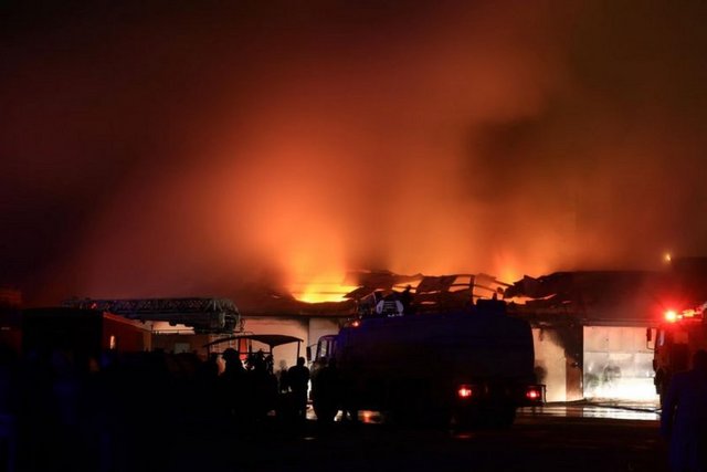 ''Yedi depodan üç tanesi zarar gördü bu yangından. Bu depolarda 5 bin metrekare halıfleksimiz zarar gördü. Karayollarının 5 bin adet yol kenar plastik dikmesi zarar gördü, trafik levhaları zarar gördü. İkinci el giysiler vardı, tasnif edilmek için bekleyen ikinci el giysiler zarar gördü. Bir miktar çocuk bezi ve tuvalet kağıdı vardı, onlar zarar gördü. Burada bizi korkutan, Karayollarının kimyasalları vardı, yol boyaları ve tinerleri, onlara sıçramadan, yangın kontrol altına alınmış durumda, soğutma çalışmaları devam ediyor. Bundan sonra artık inşallah söndürülecek.''