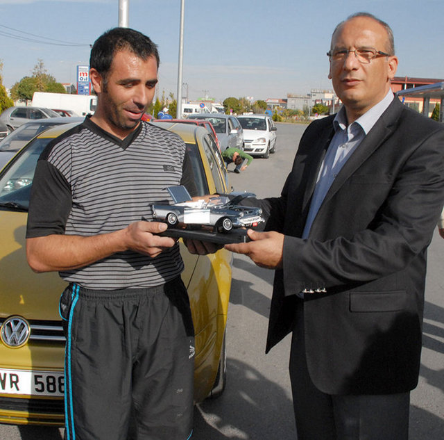 Anadolu Oto Galericiler Sitesi Yönetim Kurulu Başkanı Bilal Atabey, gösterinin ardından Pezük'e maket araç hediye etti.
