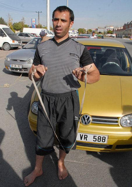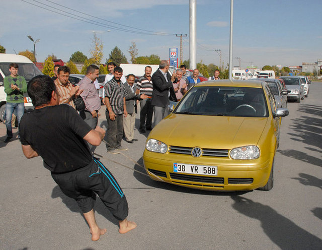 Oto Galericiler Sitesi önündeki gösteride, kısa süre ısınma hareketleri yapan PVC doğrama işçisi 36 yaşındaki Zafer Pezük, 8 otomobili halatlarla arka arkaya bağladı. En öndeki araca bağladığı ipleri de serçe parmağına bağlayan Pezük, yaklaşık 12 ton ağırlığındaki 8 otomobili 10 metre kadar çekmeyi başardı.