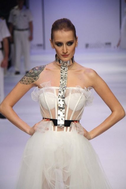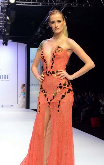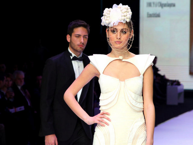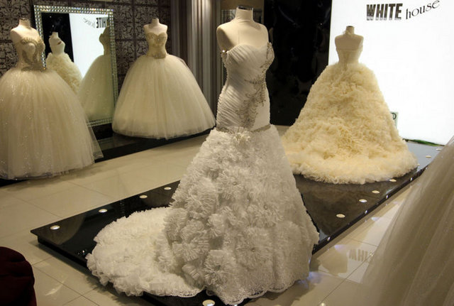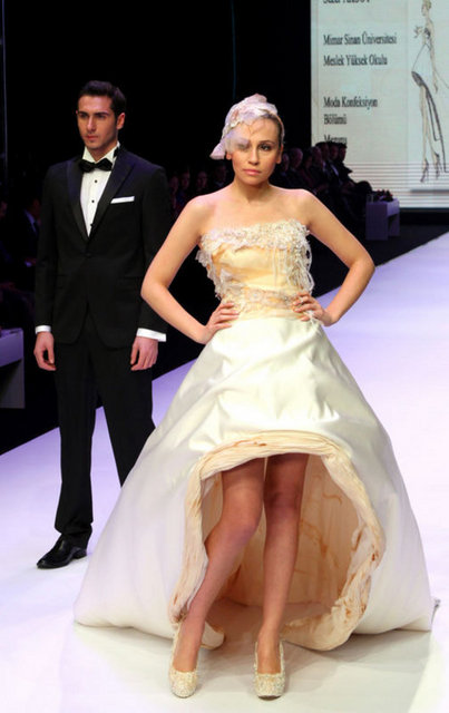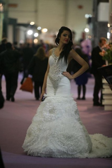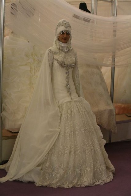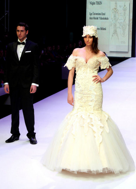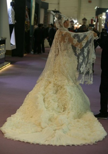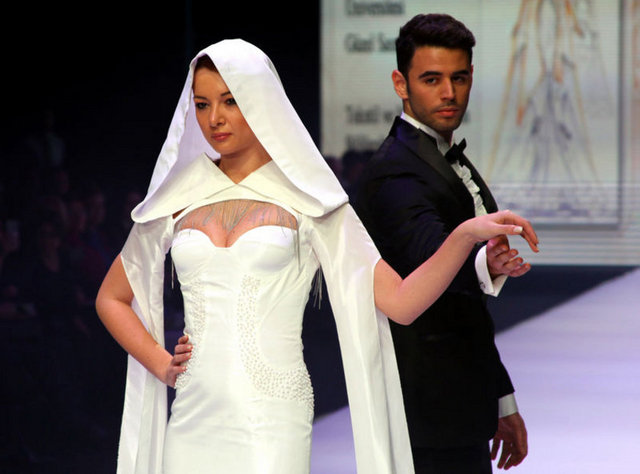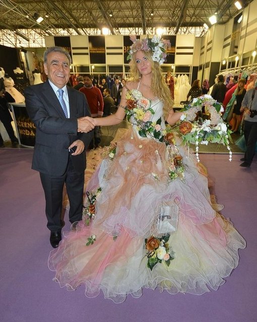 Dubai’den gelen alıcılar için modacılar tarafından özel olarak tasarlanan gelinliği tanıtan manken ise sol göğsünün üzerindeki Atatürk’ün imzasıyla dikkat çekiyor. Giydiği gelinlik de Dubai’den gelen alıcıların ilgi odağı oluyor. Fuarda ayrıca tesettür gelinlikler de yer alıyor.