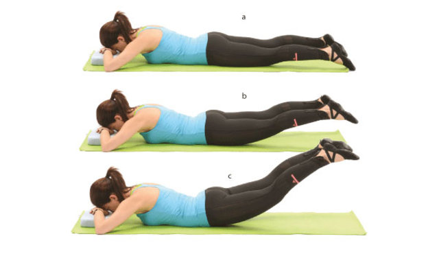 Yere yüzüstü uzan. Bacaklarını kalça genişliğinden biraz daha açık tut (a). Ayak bileklerini birbirine dola. Karnını içeri ve yukarıya doğru çekerek yerle temasını azalt (b). Nefes al, verirken karnını ve başını yerden kaldırmadan ayaklarını yukarıya doğru kaldırıp indir (c). Hareketi yaparken kalçanı sıkmayı unutma. 20 defa tekrarla