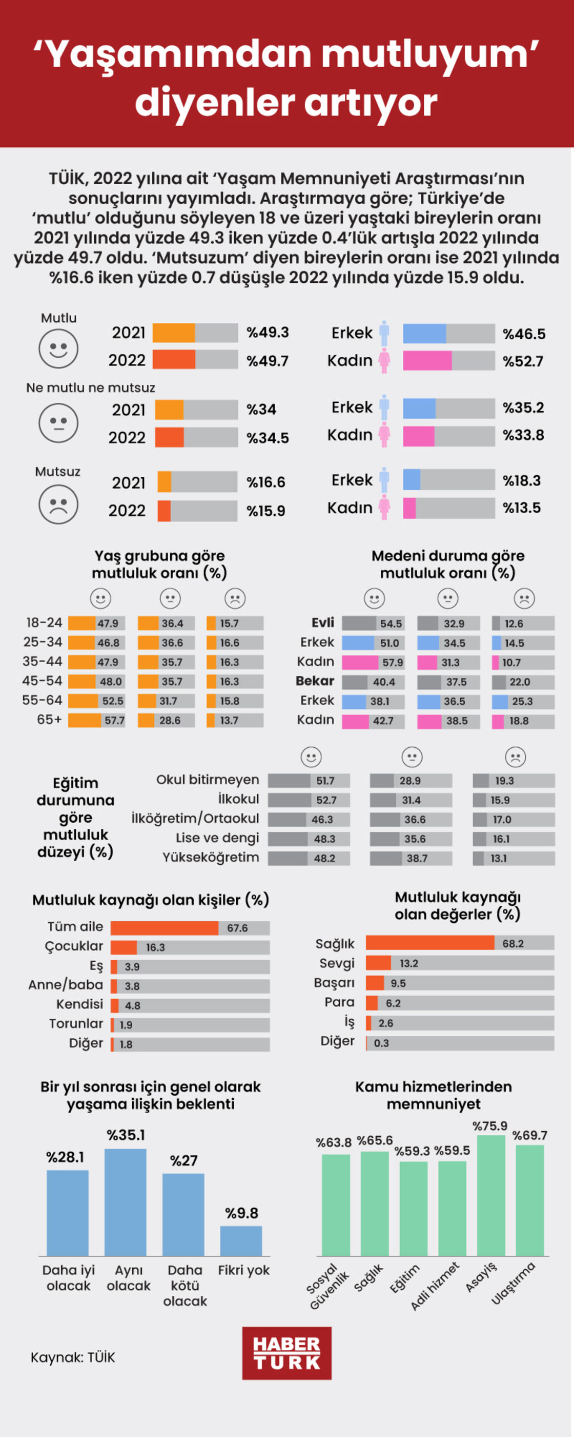 TÜİK, 2022 yılına ait 'Yaşam Memnuniyeti Araştırması'nın sonuçlarını yayımladı. Araştırmaya göre; Türkiye'de 'mutlu' olduğunu söyleyen 18 ve üzeri yaştaki bireylerin oranı 2021 yılında yüzde 49.3 iken yüzde 0.4'lük artışla 2022 yılında yüzde 49.7 oldu. 'Mutsuzum' diyen bireylerin oranı ise 2021 yılında %16.6 iken yüzde 0.7 düşüşle 2022 yılında yüzde 15.9 oldu.