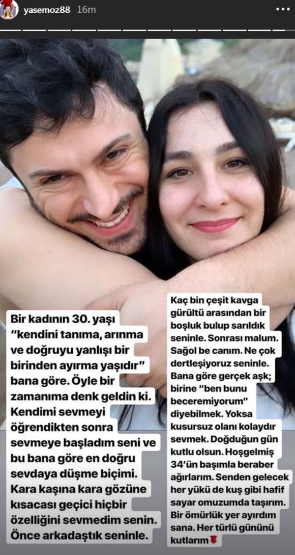 Bir kadının 30. yaşı 'kendini tanıma, arınma ve doğruyu yanlışı birbirinden ayırma yaşıdır' bana göre. Öyle bir zamanıma denk geldin ki... Kendimi sevmeyi öğrendikten sonra sevmeye başladım seni ve bu bana göre en doğru sevdaya düşme biçimi. Kara karşına, kara gözüne kısacası geçici hiçbir özelliğini sevmedim senin. Önce arkadaştık seninle... Kaç bin çeşit kavga, gürültü arasından bir boşluk bulup sarıldık seninle. Sonrası malum... Sağ ol be canım. Ne çok dertleşiyoruz seninle. Bana göre gerçek aşk; birine 'Ben bunu beceremiyorum' diyebilmek. Yoksa kusursuz olanı kolaydır sevmek. Doğduğun gün kutlu olsun. Hoş gelmiş 34'ün, başımla beraber ağırlarım. Senden gelecek her yükü de kuş gibi hafif sayar omuzumda taşırım. Bir ömürlük yer ayırdım sana. Her gününü kutlarım.