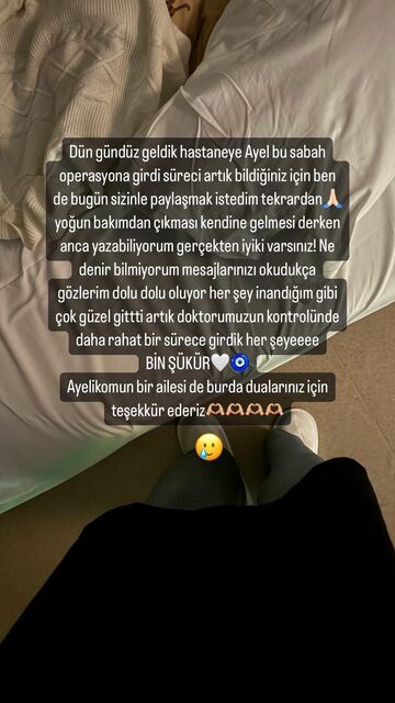 Oğlu İbrahim Ayel'in sağlık durumu hakkında bilgi veren Yasemin Şefkatli, bebeğinin operasyonunun başarılı geçtiğini müjdeleyerek şu ifadeleri kullandı: Dün gündüz geldik hastaneye. Ayel, bu sabah operasyona girdi. Süreci artık bildiğiniz için ben de bugün sizinle süreci paylaşmak istedim. Yoğun bakımdan çıkması, kendine gelmesi derken anca yazabiliyorum. Gerçekten iyi ki varsınız. Ne denir bilmiyorum mesajlarınızı okudukça gözlerim dolu dolu oluyor. Her şey inandığım gibi çok güzel gitti. Artık doktorumuzun kontrolünde daha rahat bir sürece girdik. Her şeye bin şükür... Ayelikomun bir ailesi de burada dualarınız için teşekkür ederiz.