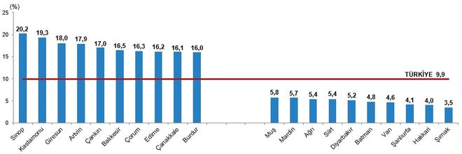 Yaşlı nüfus oranının en yüksek olduğu il, 2022 yılında yüzde 20.2 ile Sinop oldu. Bu ili yüzde 19.3 ile Kastamonu, yüzde 18 ile Giresun izledi. Yaşlı nüfus oranının en düşük olduğu il ise yüzde 3.5 ile Şırnak oldu. Bu ili yüzde 4 ile Hakkari ve yüzde 4.1 ile Şanlıurfa izledi.