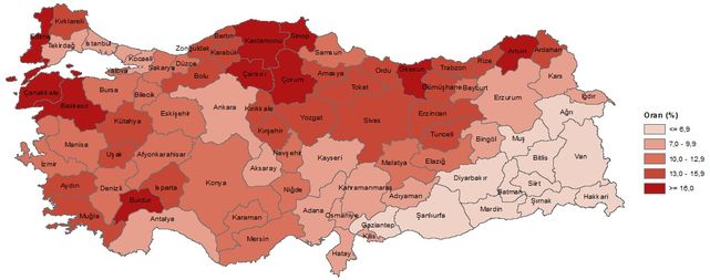 2017 yılında yüzde 8.5 olan Türkiye'deki yaşlı nüfus oranı 2022'de yüzde 9.9'a yükseldi. Böylece yüzde 9.8'lik dünya ortalamasının üzerine çıkıldı. Türkiye'de yaşlı nüfusun en yoğun olduğu il yüzde 20.2 ile Sinop, en düşük olduğu il ise yüzde 3.5 ile Şırnak olarak kayıtlara geçti