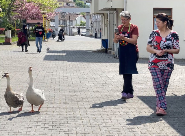 Zonguldak'ın Karadeniz Ereğli ilçesinde yaşayan Filiz Turhan, yavruyken sahiplendiği kazlarla parka gidiyor, yürüyüşe ve alışverişe çıkıyor