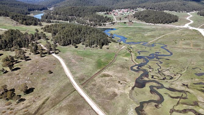 Bolu'da yemyeşil meraların bulunduğu Sarıalan Yaylası'nda eriyen kar suları ve yağmurla dolan mendereslerin oluşturduğu manzara dron ile görüntülendi
