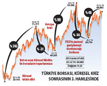- 17 Aralık’ta FED kararından ve nisan sonuna kadar faiz artırmayacağı garantisi vermesinden dolayı piyasaların iştahı arttı. Yılı yükselerek kapatıyorlar. Gelecek yılın ilk dört ayında faiz artışı olmayacağı gibi, AB, Japonya, Çin gibi büyük merkez bankalarının parasal gevşemeleri gündeme gelecek. 2014’ten gelen eğilimin kesintiye uğramadan yeni yılda da devam edeceği beklenebilir. Bu durumda yılın ilk haftaları veya ayları pozitif bir eğilimle geçer. Çoğu piyasa tepe noktasını yapar ve kâr realizasyonları ile ABD’nin faiz artırım sürecine girerler.