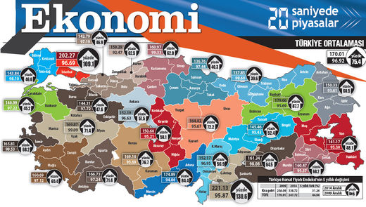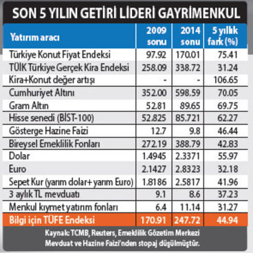 Son yıllardaki konut fiyatlarındaki hızlı artışlar “taşı toprağı altın” sözünü doğruladığı gibi, onun da ötesine geçti. TÜİK’in aralık verilerini açıklaması ile Türkiye’de konut fiyatlarının son 5 yıllık ortalama artışı belli oldu. Gayrimenkul veya konut yatırımları, en çok kazandıran ana finansal yatırım araçlarını da geçti. 2010-2014’ü kapsayan son 5 yılda Türkiye Konut Fiyat Endeksi yüzde 75.4 arttı. Altın fiyat artışının 5 puan da üzerine çıktı. Hiçbir finansal ana yatırım aracı konut yatırımından elde edilen kanancı yakalayamadı.