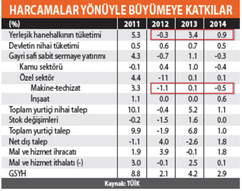 ■ Bu durumda geçen yılki büyüme oranını korumak için dahi, iç talebi artırmak gerekecek. Bitişikteki tablodan görülebileceği gibi, 2011’den itibaren cari açık nedeniyle bilinçli şekilde ekonominin frenine basıldı. Kredilere sınır ve taksitli alışverişe sınır konuldu. Sonuçta amaçlanan da sağlandı. Tüketimin büyümeye verdiği katkı azaldı ve sıfır düzeyine kadar indi. İç tüketim milli gelirin üçte ikisinden fazlasını oluşturuyor.