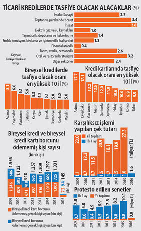- Bireysel kredi kartında tasfiye olacak alacak oranında yine yüzde 17.7 ile Adana ilk sırada. Onu yüzde 17.1 ile Diyarbakır, yüzde 13.2 ile Gaziantep, yüzde 12.5 ile Mersin, yüzde 12 ile Şanlıurfa onu da Osmaniye ve Hatay izliyor. Bu nedenledir ki bireysel kredi ve kredi kartı borcunu ödeyemeyen kişi sayısı 2015’te 1 milyon 331 bin ile 2009’dan sonra en yüksek düzeyine çıktı. Ocaktaki rakam da 145 bin ile geçmiş yılların üstünde ve bu yılı 1.5 milyonun üzerinde bitirmeye adayız.