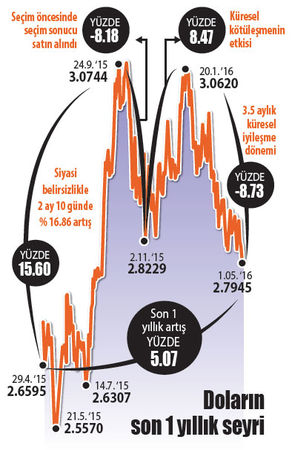 -Ardından dışarısının durulması, içeride seçim sonrasının satın alınmaya başlanması ile dolar yüzde 8 geriledi. Ama aralık ayında Çin ve ABD faiz artırımı çifte olumsuzluk olarak ortaya çıktı. Bu durum ocak ayının son haftasına kadar da sürdü. Dolar TL karşısında 20 Ocak’ta 3.0620 ile ikinci en yüksek düzeyine çıktı. Merkez bankalarının koordinasyonunda yeni bir parasal gevşemenin yürürlüğe konulması, ABD’nin faiz artırımından çark etmesi, küresel ve Türkiye piyasalarında (U) dönüşüne yol açtı.