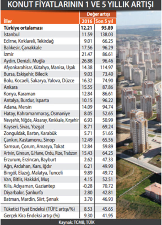 - 2016’da en dikkat çekici gelişme ise konut sektörünün sürükleyicisi durumundaki İstanbul’un fiyat artışlarında diğer il ve bölgelerin gerisinde kalmaya başlamasıydı. İstanbul yüzde 11.59’luk fiyat artışıyla Türkiye ortalamasının da altına indi. Ancak son beş yıllık birikimli artışta yüzde 138’le hâlâ açık ara önde bulunuyor.