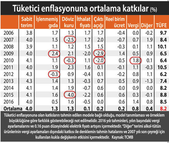 Tahminlerin bu yönde çıkmasının ilk şartı döviz kurunda yeni bir yukarı yönlü sıçrama görülmesine bağlı. Çünkü döviz kurundaki değişimler enflasyonu en çok etkileyen unsurların başında geliyor. TCMB’nin cuma günü açıkladığı yılın ikinci Enflasyon Raporu’nda “Enflasyon Dinamiklerindeki Değişim” bir kutu olarak ele alındı. 2006 ile 2016 arasındaki 10 yılı kapsayan rakamların analizinden ortaya çıkan tablo oldukça çarpıcı.