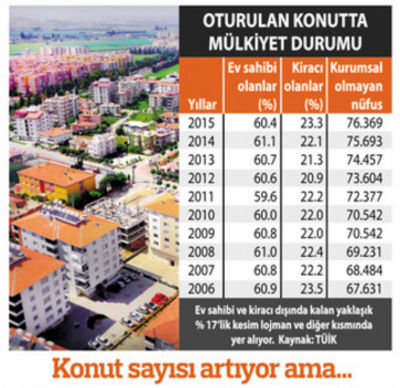 - Üretilen ve satılan konutların büyük şehirlerde, ortanın üstü ve üst gelir grubuna yönelik olması da bunu doğruluyor. Geliri düşük olanlar ve orta gelirliler bu konutları satın alamıyor. Uzun süreli borç altına da giremiyor. Kiracıysa kiracı olmaya devam ediyor. Gecekondusu varsa da kentsel dönüşümü bekliyor. Bu nedenle de nüfusun kiracı olan kısmında henüz bir azalma yok. 10 yıl önce yüzde 23.5 olan kiracı oranı bugün yüzde 23.3 düzeyi ile yine aynı.