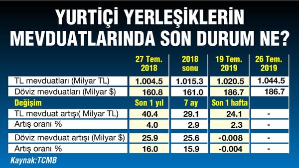 -Dün açıklanan haftalık Merkez Bankası verileri 19-26 Temmuz haftasında faiz indiriminden sonraki iki işlem gününü kapsıyor. İki günlük rakamların yer aldığı haftalık veriye göre TL mevduatlar uzun bir aradan sonra ilk kez 24 milyar liralık bir sıçrama yaptı. Bir haftada yüzde 2.4 artan yurtiçi yerleşiklere ait TL mevduatlar 1 trilyon 44.5 milyar liraya çıktı.