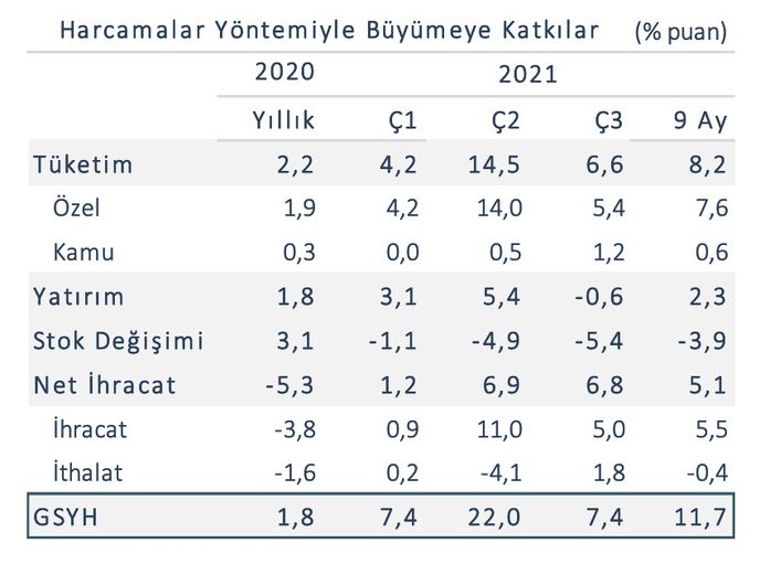 Dün sabah saatlerinde açıklanan yılın üçüncü çeyreğine ait GSYH verisi yüzde 7.4’lük büyümeyi gösterdi. Böylece önceki çeyreklerin katkısıyla 9 aylık büyüme yüzde 11.7’ye vardı. Yılı çift haneli büyümeyle kapatacağımız artık yüksek bir olasılık.