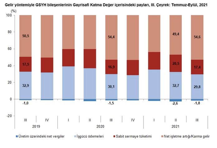 -Nedeni de büyümeden işgücü ödemelerinin aldığı payın gerilemesi. Yani çalışanların pastası büyümemiş, küçülmüş. TÜİK’in gelir yöntemiyle GSYH bileşenlerinin gayrisafi katma değer içerisindeki paylarına göre işçi ödemelerinin payı bir önceki çeyrekte yüzde 32.7 düzeyinden üçüncü çeyrekte yüzde 29.8’e indi. Çalışanlar için pastadan alınan pay 3 puan daha eksildi.
