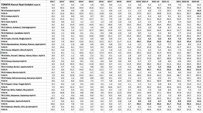 Konut fiyatları rekor artışlar devam ediyor. Kasım başlayan, aralık ve ocak aylarında süren rekorlar şubat ayında yenilendi. Konut fiyatları sadece şubatta yüzde 13.5, yıllıkta yüzde 96.4 arttı. Türkiye’de ilk kez konut fiyatları yüzde 100’ün eşiğine vardı. Yeni konut fiyatları yüzde 102 düzeyine ulaştı.