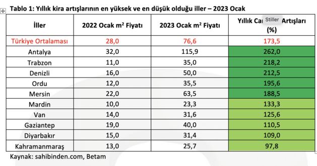 Sahibinden.com’da yer alan ilanlardan BETAM’ın hesapladığı kira endeksi ise son bir yılda Türkiye ortalamasında yüzde 173.5 arttı.