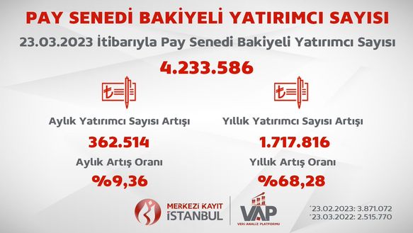 ➔ Saklamacı kuruluş Merkezi Kayıt İstanbul’un bitişikte yer alan verisine göre 23 Mart itibariyle borsada yerli bireysel yatırımcı sayısı 4 milyon 233 bine ulaştı.