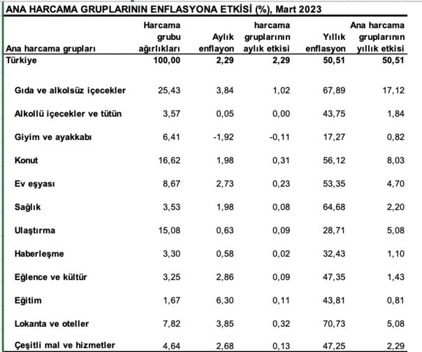 ➔Ancak bu iniş yıllık rakamlarla ve yüksek baz etkisinden kaynaklı. Yoksa aylık bazda artışlar sürüyor. TÜFE mart ayında yüzde 2.29, ilk üç ayda yüzde 12.52 arttı. Artışın sonraki aylarda da böyle devam etmesi durumunda yılın sonunda yüzde 50’lik rakamlar ortaya çıkacak.