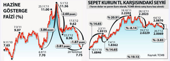 BU YIL % 8 DEĞERLENDİ: Merkez Bankası'nın Kasım 2010 da yürürlüğe koyduğu yeni para politikası çerçevesinde, TL kontrollü biçimde değer kaybetti. Sepet kura göre 2.22 ile 19 Ekim 2011 de tavan düzeyine çıkan TL, 11 ayda yüzde 24 kayba uğradı. Ancak ağustos ayında, AB krizinin yeniden alevlenmesiyle Merkez Bankası tutumunu değiştirdi. TL'nin değer kaybı yerine değer kazanmasını amaçladı. Bu politika ekimden itibaren sonuçlarını vermeye başladı. 19 Ekim ile 20 Temmuz arasındaki 9 ayda TL yüzde 10.61 değer kazandı. Yılbaşından bu yana oluşan değer artışı da yüzde 8.11 düzeyine vardı.