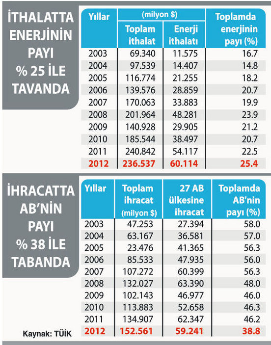 ■ İhracattaki asıl kazanım ise AB pazarını ikame edecek yeni pazarların bulunması oldu. Avrupa krizinden dolayı 2012 bu ekonomilerin daraldığı bir yılda Türkiye'den yapılan ithalat da doğal olarak azaldı. Türkiye'nin 27 AB ülkesine ihracatı yüzde 5 azaldı ve toplam 62.4 milyar dolardan 59.2 milyar dolara indi. Toplam ihracat içinde AB'nin payı da yüzde 38.8 ile tarihi en düşük düzeyine geriledi.