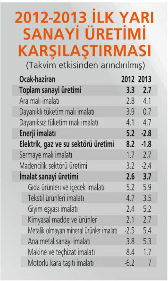 Yılın ilk yarısı itibarıyla toplam sanayi üretimlerini karşılaştırınca 2012'deki yüzde 3.3 artışa karşı bu yıl yüzde 2.7'lik artış var. Enerji ve madenciliği dışlayan imalat sanayi üretimine baktığımızda tam tersi çıkıyor. Yılın ilk yarısında imalat sanayii yüzde 3.7 artarken geçen yıl bu rakam yüzde 2.6 idi. Çünkü madencilik geçen yıl yüzde3.2 büyürken bu yıl yüzde 2.4 daraldı, enerji üretimi de yüzde 8.2 artıştan yüzde 1.8 azalmaya indi. Hava koşullarından dolayı tüketilmeyeceği için elektriği üretmenin, doğalgazı elektriğe dönüştürmenin anlamı kalmadı. Toplam sanayi üretimi içinde iki ana sektörün payı yüzde20'ye yaklaşıyor.