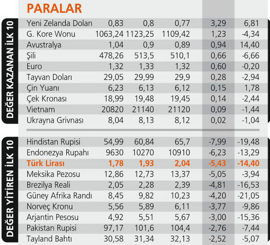 TL DÜŞÜŞTE 3. SIRADA: Dolar karşısında para birimlerinin performansına bakılınca Türk Lirası ağustos ayında en çok değer yitiren 3. para birimi. Yüzde 5.43 düzeyinde bir kaybı var. En çok kayıplı 10 para birimi arasında gelişmiş ülke olarak sadece Norveç 7. sırada yer alıyor. En başta ise Hindistan, ikinci sırada Endonezya yer alıyor. 8 aylık dönemde ise TL değer kaybında 5. sırada bulunuyor. Dolara karşı değer kaybı yüzde 14.40. Kayıpta ilk 10'a giren gelişmiş iki ülke parası ise Norveç Kronu ve Japon Yeni. Türkiye'nin önünde sıralanan ilk beş ise yaşanan trendi tam yansıtıyor: Güney Afrika, Hindistan, Brezilya ve Arjantin para birimleri.