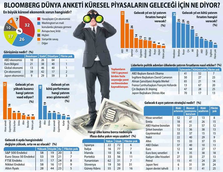 Finansal piyasalara yayın yapan Bloomberg Ajansı'nın üç ayda bir yaptığı Global Anket yayımlandı. Bloomberg'in 900 çalışanı yanında dünya üzerinde Bloomberg terminali kullanan 300 binden fazla katılımcının yanıtladığı anket, finansal piyasaların olası risklerini ve fırsatlarını kapsıyor. Finansal tecrübesi yüksek piyasa profesyonelleriyle yapılan anket, FED'in parasal genişlemeden çıkışı başlatacağı bir dönemde yatırımın adresi olarak ABD, AB, İngiltere'yi, araç olarak da hisse senedi, dolar ve gayrimenkulu gösteriyor. Küresel çapta faizin yükseleceği tahmin edildiğinden, başta ABD, AB ve Japonya hazine tahvilleri olmak üzere borçlanma senetlerinden kaçış öngörülürken, Çin küresel ekonominin en büyük riski gibi kabul ediliyor. Anketten çıkan önemli sonuçlar şöyle özetlenebilir: