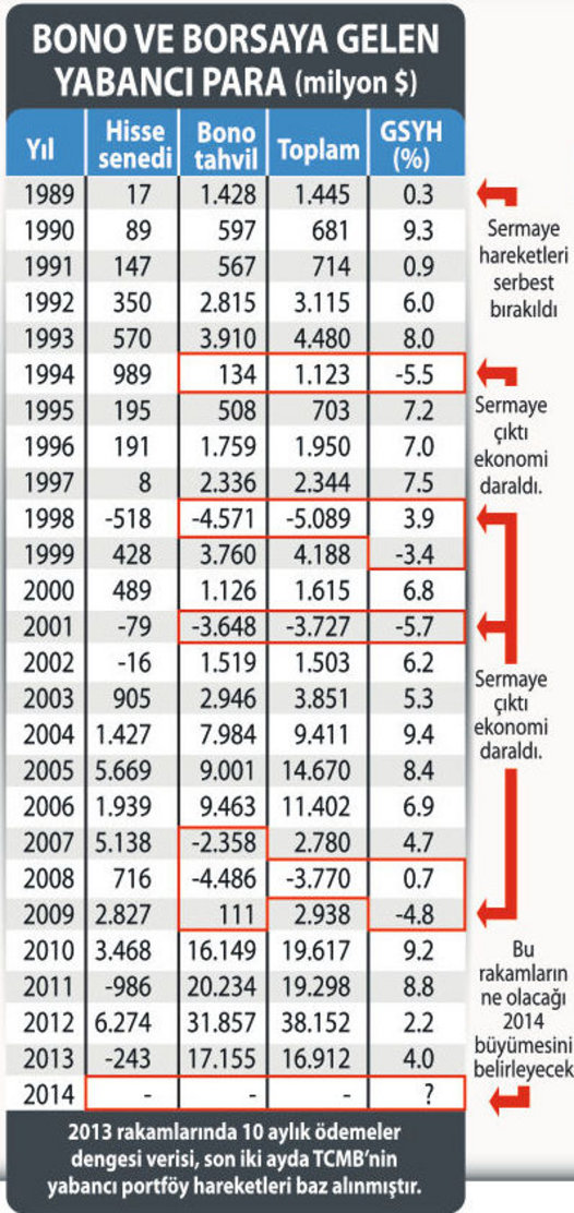 2 SEÇİM DE ÜSTÜNE: Üstelik 2014 yılında iki seçim var. Mevcut hükümet de son 10 yılda biri hariç her seçime yüksek büyümeyle girdi. 2009'da ekonomi daralırken yapılan yerel seçim ise iktidarın oylarının gerilediği tek seçim oldu. Dolayısıyla 2014'te yabancı sermaye hareketlerinin önemi sadece piyasalar ve ekonomi için değil aynı zamanda iktidar partisi için de kritik önemde.