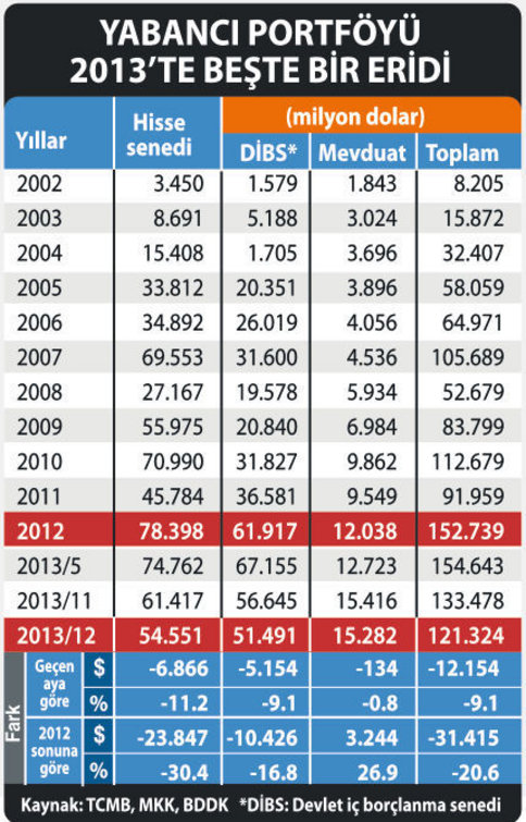 ■ 2013'te yüzde 18'e varan TL'nin kaybı yerlilerin toplamda finansal varlığını büyütmesini önledi. Hatta yerlilere ait toplam finansal varlıkların dolar bazındaki karşılığı 17 milyar dolar azaldı ve 502 milyar dolara indi. Yani Türkiye'de yaşayanların finansal sistemdeki servetleri yarım trilyon dolar.