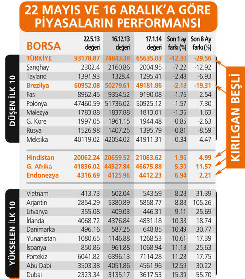 ■ İstanbul Borsası son bir ayda yüzde 12.3 değer yitirdi. Bu kayıp da İstanbul Borsası nı en çok düşenlerin başına yerleştirdi. En yakın takipçisi Şanghay Borsası yüzde 7.2 düştü. En çok değer kaybeden ilk 10 borsa içinde kırılgan beşliden Brezilya 2.2 ile 4. sırada yer alıyor. Kırılgan beşlinin diğer borsaları ise prim yaptı.