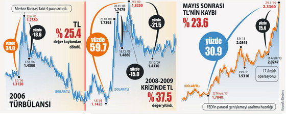 Dış finansman ihtiyacı yüksek bir ekonomi olarak kaderimiz zaten 22 Mayıs'ta FED'in parasal genişlemeyi azaltmaya hazırlandığını açıklamasıyla değişmişti. Üzerine Gezi olaylarının etkisi bindi. Son olarak 17 Aralık operasyonunun getirdiği siyasi risk de eklendi. Geçen hafta başında işlediğimiz gibi, Türkiye finansal piyasaları 22 Mayıs sonrasında dünyadan net bir şekilde negatif ayrıştı. Mart 2009'dan sonra 4 yılı aşkın sürede pozitif eğilimde başı çeken Türkiye mayıs sonrasında tersi yönde, negatif eğilimde de başı çekiyor. Bunda da temel olgu dış finansman ihtiyacının yüksekliği. Üzerine iç siyasi riskler ve seçim etkileri de binince dolar ateşi yükseldi. Geçen hafta sonu TL karşısında 2.3360'ı gören dolar kuru mayısa göre yüzde 30.9, 16 Aralık'agöre yüzde 15.4 arttı. Bu artışlar doların TL karşısındaki değeri üzerinden. Bizim asıl bakmamız gereken TL'nin değerinin ne olduğu. O da mayıs başına göre yüzde 23.6 değer kaybını işaret ediyor.