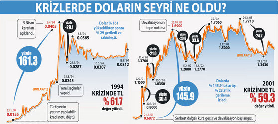 Aşağıda geçmiş devalüasyon dönemlerinde doların seyri yer alıyor. Faizin artırılmaması yönünde kararlılık sürerse ekonominin bünyesindeki, hatta Türkiye'deki bütün rahatsızlıkların bedelini kurda göreceğiz, kur yoluyla ödeyeceğiz. Kur belli bir yere kadar yükselecek. Orasının neresi olacağını piyasaların yanında, ekonomi yönetimi, küresel gelişmeler ve siyasi gelişmeler belirleyecek. Ama önce kantarın topu bir kaçacak, kur oturacağı denge değerinden yukarıya çıkacak. Ardından da geri gelecek ve denge değerine oturacak. Geçmişteki devalüasyonlarda TL'nin değer kayıpları yüzde 50-60'lara varmış. Doların artışı yüzde 60 ile 161 arasında değişmiş. Ardından aşırı yükselişin yüzde 20-30'u budanmış. Kur denge değerine geri dönmüş. Bu kez de hükümet ve Merkez Bankası faiz artırımına gitmeyip devalüasyonun önünü açık tutarsa bir benzeri yaşanabilir. Kur oturacağı yeni denge değerinin önce yüzde 3040 yukarısına çıkar, sonra yüzde 20-30 değer kaybederek sakinleşir.